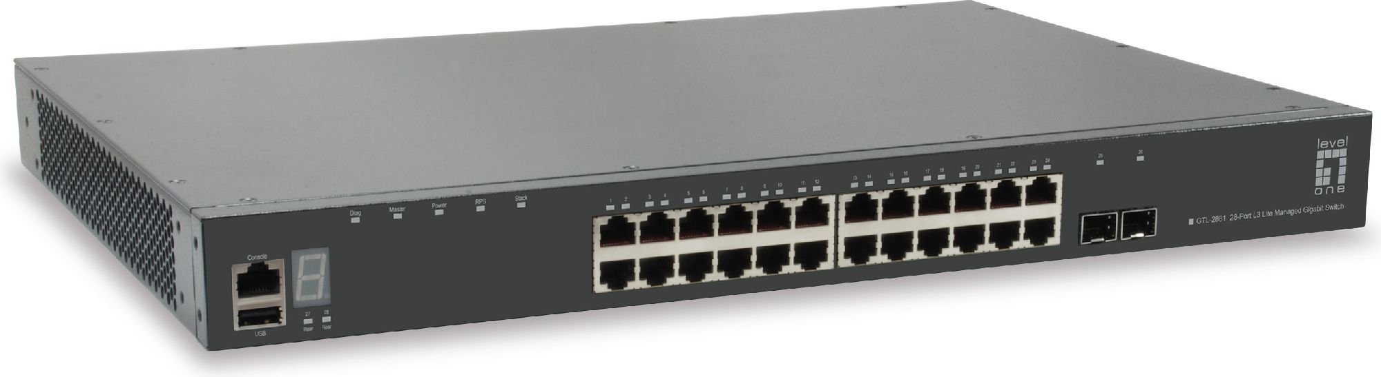 LevelOne GTL-2881. Slēdža tips: Vadīts, Slēdža līmenis: L3. Basic switching RJ-45 Ethernet portu veids: Gigabit Ethernet (10/100/1000), Basic switching RJ-45 Ethernet portu daudzums: 24, Konsoles pieslēgvieta: RJ-45. Pilns duplekss. Adrešu tabulas izmērs: 16000 ieraksti, Komutācijas ietilpība: 128 Gbit/s. Tīkla standarts: IEEE 802.1D, IEEE 802.1Q, IEEE 802.1p, IEEE 802.1s, IEEE 802.1w, IEEE 802.1x, IEEE 802.3ad, IEEE.... Statņa montāža