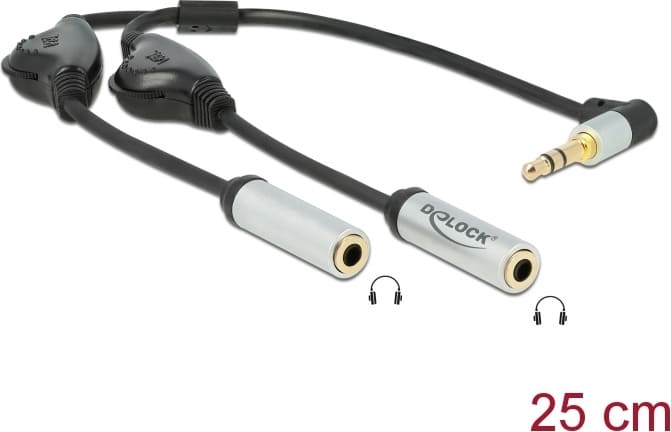 Easy handling Due to the additional gold ring at the end of the connector, this audio splitter can easily be connected to devices, which are protected by a cover. Furthermore the 3.5 mm stereo jack male connector is angled in case the existing port is difficult to access. System requirements: • A free stereo port 3.5 mm 3 pin Specification: • Connectors: 1 x 3.5 mm 3 pin stereo jack male angled > 2 x 3.5 mm 3 pin stereo jack female • 2 x volume control buttons • Cable gauge: 30 AWG • Contacts gold-plated • Length incl. connectors: ca. 25 cm • Colour: black Package content: • Audio splitter adapter cable Data sheet: http://www.delock.de/produkt/66434/pdf.html?sprache=en