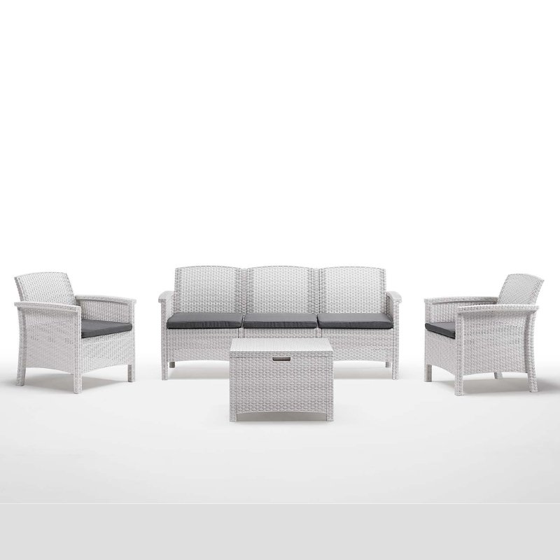 Īpaši elegants, ērts un izturīgs dārza mēbeļu komplekts Venezia ar trīsvietīgu dīvānu garantēs ērtu, mierpilnu un relaksējošu atpūtu, papildināts ar rotangpalmas pinuma rakstu. Dārza mēbeļu komplekts Venezia 3 ir izgatavots no augstas kvalitātes otrreiz pārstrādājama polipropilēna un stikla šķiedras kombinācijas, izmantojot injekcijas liešanas tehnoloģiju, kas piešķir tam lielu izturību ikdienas lietošanā un noturīgumu pret nelabvēlīgiem laikapstākļiem. Ideāls atpūtas telpu komplekts jebkurā iekārtojuma kontekstā: privāti - iekštelpās, uz balkona, terases vai dārzā, un arī profesionālā kontekstā, piemēram, bāros, kafejnīcās un daudz kur citur. Dārza mēbeļu komplekts Venezia 3 ne tikai garantē izcilu izturību, bet arī sniedz viesiem lielisku komfortu, pateicoties lielajām sēžamajām virsmām un slīpajai ergonomiskajai atzveltnei. Būtiska papildus priekšrocība - saliekams bez metāla daļām, piemēram, skrūvēm vai bultskrūvēm, kas laika gaitā un brīvā dabā, pakļauti mitrumam vai sliktiem laikapstākļiem, var sarūsēt. Izgatavots pēc īpašas tehnoloģijas - montāžai nav nepieciešami nekādi instrumenti. Praktiska un precīza sistēma, kas nodrošina augstu montāžas vienkāršību.