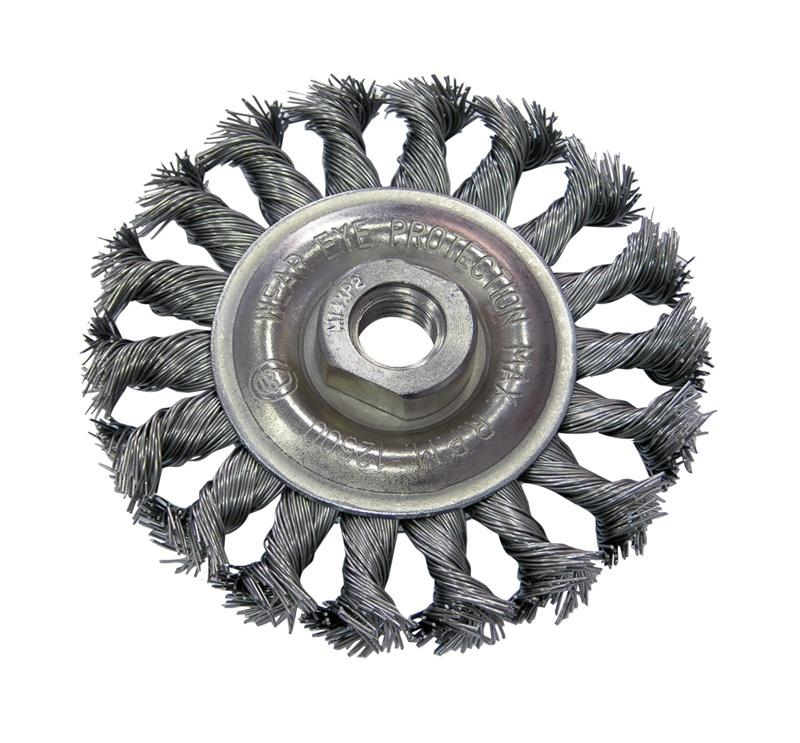 Diskveida birste ar vītiem tērauda sariem un M14 centra vītni. Izmantošanai ar leņķa slīpmašīnu. Paredzēta smagiem darbiem, rūsas, krāsas noņemšanai, asu malu noņemšanai utt. Birstes diametrs 100 mm.