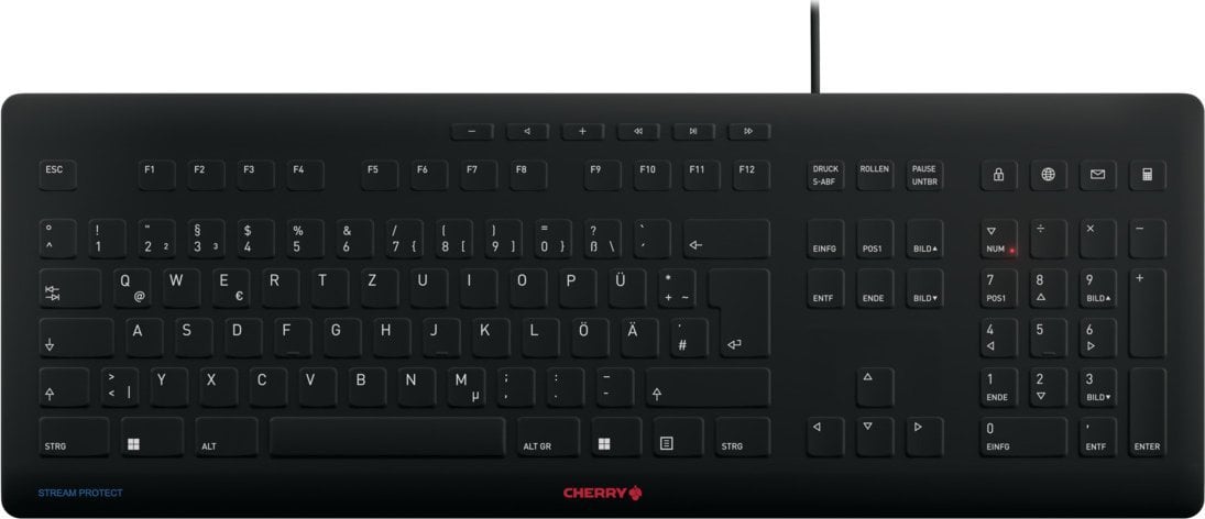 CHERRY Stream. Tastatūras veids: Taisni. Savienojamības tehnoloģija: Vadu, Ierīces interfeiss: USB, Tastatūras izkārtojums: QWERTZ, Tastatūras taustiņu skaits: 115. Kabeļa garums: 1,8 m. Ieteicamais pielietojums: Universāls. Produkta krāsa: Melns