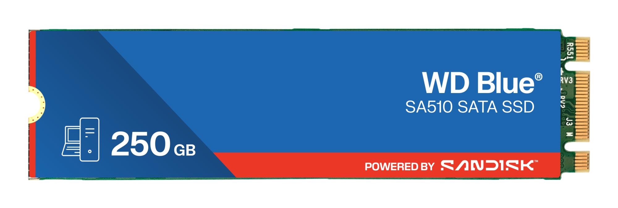 SSD series Blue SA510 | POWERED BY SANDISK | 250 GB | M.2 | Serial ATA III | Component for PC/Laptop | M.2 SSD size 2280 (22 x 80 mm) | Write speed 440 MB/s | Read speed 555 MB/s | Mean time between failures (MTBF) 1750000 h | 100xTBW rating | Weight 4.8 g | Operating temperature (T-T) 0 - 70 °C
