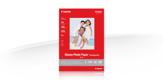 Canon GP-501 Glossy Photo Paper A4 - 100 Sheets. Finish type: Gloss, Media weight: 200 g/m², Paper size: A4. Paper dimensions: 210 x 297 mm