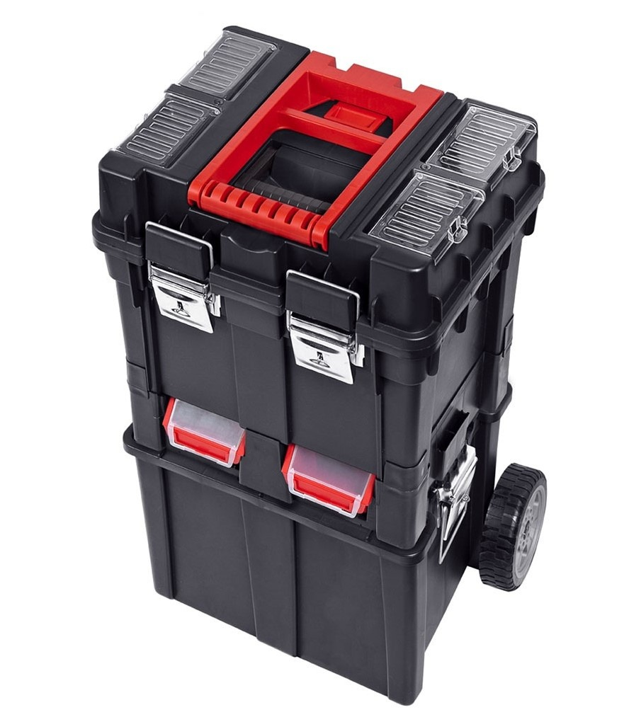 Instrumentu kaste uz riteņiem HD Compact. Plastmasas riteņi ar gumijas slāni, metāla ass, metāla aizbīdņi, polikarbonāta organizatori vāciņā. Kastes izmēri 495 x 360 x 710 mm.