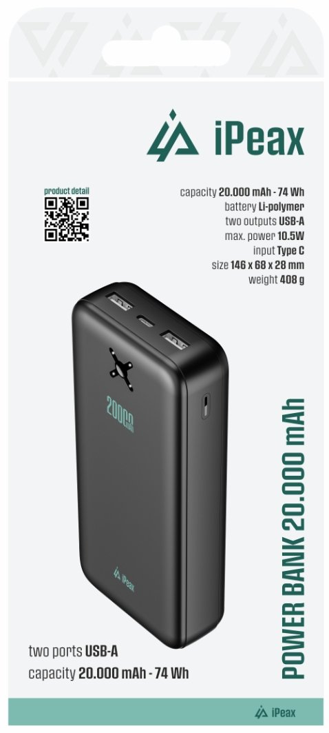 Galvenās iezīmes: Augsta ietilpība 20 000 mAh Divas USB-A pieslēgvietas ar kopīgu izejas jaudu līdz 10.5W LED indikatori akumulatora statusa uzrādīšanai reāllaikā Kompakts, bet izturīgs dizains ar liesmu slāpējošu korpusu Komplektā iekļauts USB-A uz USB-C kabelis (2 A, 0,4 m) Gluds, matēti melns apdare ar minimālistisku iPEAX zīmolu