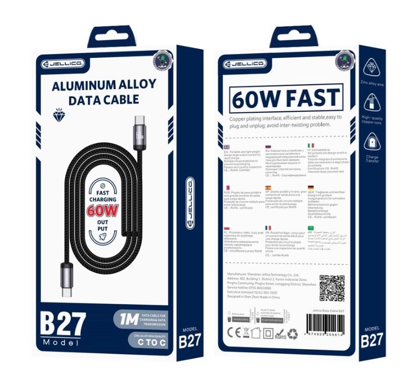 Jellico B27 Woven Cotton Universal USB-C to USB-C Data & Fast PD 60W Charger Cable 1m Black