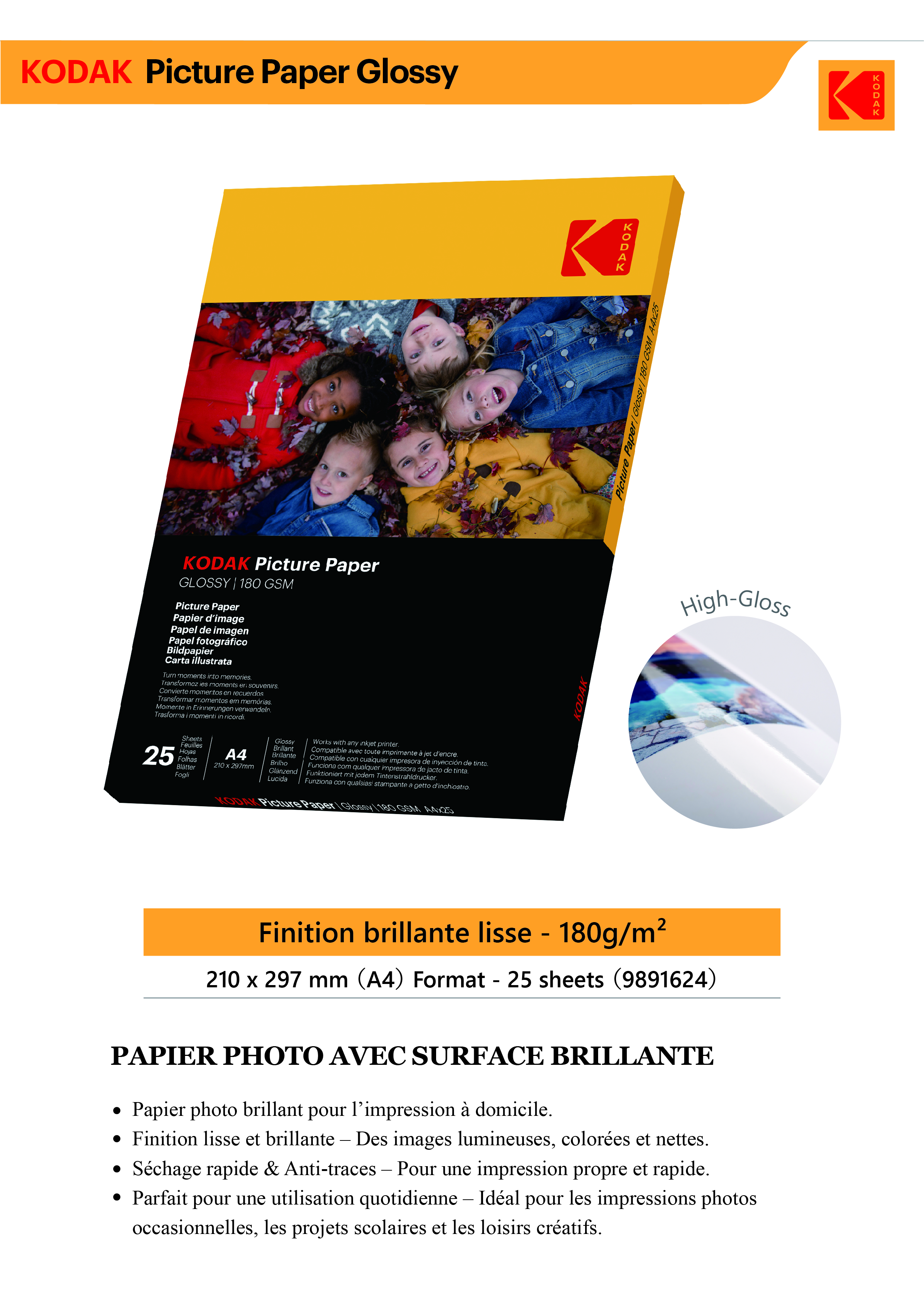 | Fotoattēli ar spīdīgu virsmu Ikdienas spīdīgs fotopapīrs drukāšanai mājās Gluda, spīdīga apdare — rada spilgtus, krāsainus un asus attēlus. Ātri žūstošs un neizsmērējas — nodrošina ātru un tīru drukas rezultātu. Lieliski piemērots ikdienas lietošanai — lieliski piemērots ikdienas fotoattēlu drukāšanai, skolas projektiem un “dari pats” rokdarbiem. |