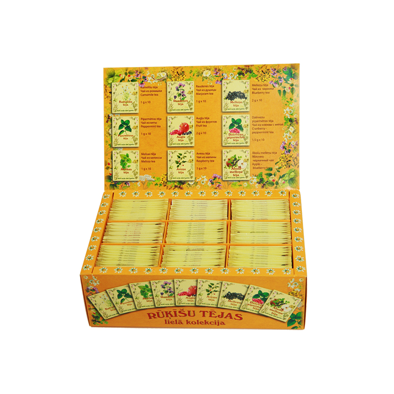 • Komplekts sastāv: Kumelīšu tēja - 10gab. Piparmētras tēja - 10gab. Melisas tēja - 10gab. Raudenes tēja - 10gab. Augļu tēja - 10gab. Aveņu tēja - 10gab. Melleņu tēja - 10gab. Dzērveņu-piparmētras tēja - 10gab. Ābolu-melleņu tēja - 10gab.