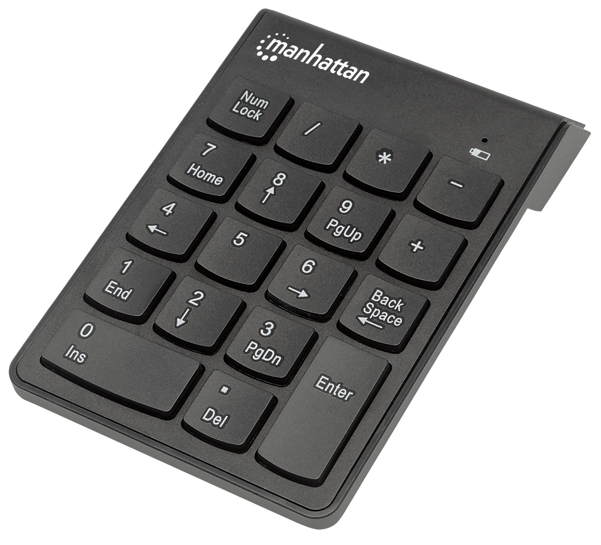 Manhattan Numeric Keypad, Wireless (2.4GHz), USB-A Micro Receiver, 18 Full Size Keys, Black, Membrane Key Switches, Auto Power Management, Range 10m, AAA Battery (included), Windows and Mac, Three Year Warranty, Blister. Device interface: RF Wireless, Keyboard number of keys: 18, Purpose: Laptop/PC. Product colour: Black. Weight: 90 g