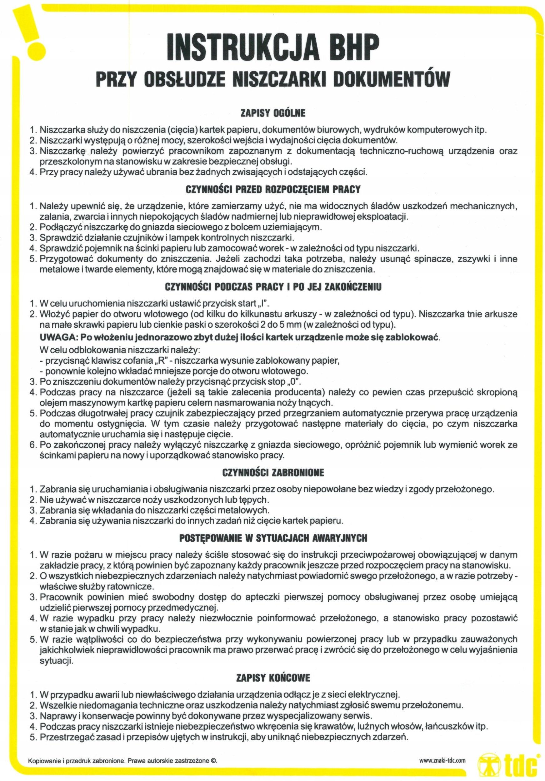 PROCERA Znak TDC, Instrukcja BHP przy obsudze niszczarki dokumentów