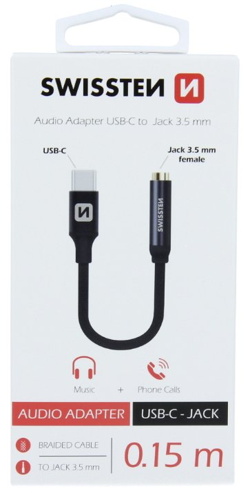 Аудиоадаптер с разъемом USB-C и разъемом jack (гнездо). Адаптер поддерживает телефонные звонки и музыку. Упакован в розничную упаковку Swissten.