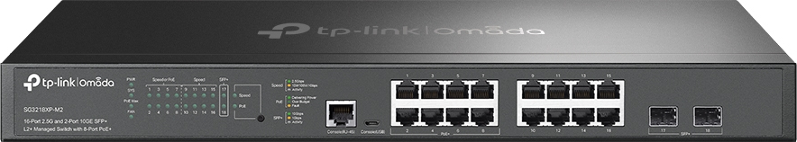 TP-Link Omada 16-Port 2.5G and 2-Port 10GE SFP+ L2+ Managed Switch with 8-Port PoE+. Switch type: Managed, Switch layer: L2+. Basic switching RJ-45 Ethernet ports type: 2.5G Ethernet (100/1000/2500), Basic switching RJ-45 Ethernet ports quantity: 16, Console port: RJ-45/Micro-USB. MAC address table: 16000 entries, Switching capacity: 120 Gbit/s. Networking standards: IEEE 802.1D, IEEE 802.1s, IEEE 802.1w. Power connector: AC-in jack. Power over Ethernet (PoE). Rack mounting, Form factor: 1U Ultrafast 2.5G PoE+ Managed Switch with 10G Uplink for Futuristic Network