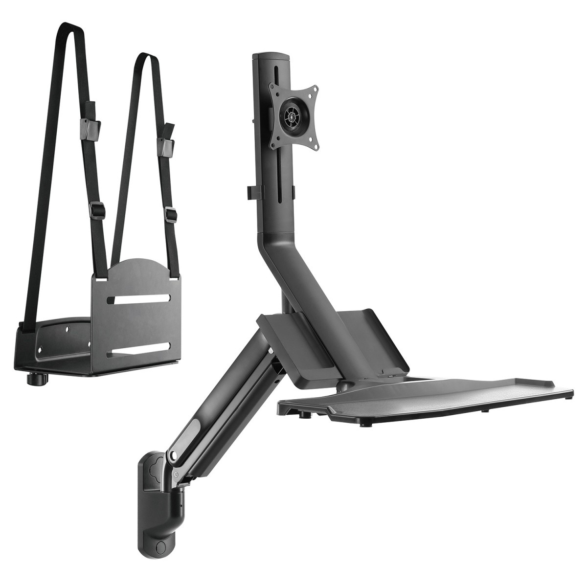 Uniwersalna ścienna stacja robocza z uchwytem na monitor i klawiaturę MC-838 umożliwia pracę przy komputerze bez konieczności korzystania z biurka. Uchwyt został wykonany z najwyższej jakości metalu (połączenie stali, aluminium formowanego ciśnieniowo oraz tworzywa) w kolorze czarnym. Elementy uchwytu zostały idealnie dopasowane zapewniając stabilną i bezpieczną podporę do monitora i klawiatury. Zmiana pozycji z siedzącej do pozycji stojącej zapewnia duży komfort w pracy oraz optymalizuje ergonomię. Wbudowaną sprężyna gazowa pozwala na płynną regulację wysokości, a dołączony uchwyt komputera umożliwia montaż komputera stacjonarnego PC na bocznym blacie biurka lub na ścianie. Uchwyt przeznaczony jest do montażu monitorów LCD, LED, plazmowych różnych marek o wadze do 9 kg i wymiarach przekątnej ekranu od 17 do 32. Kompatybilny z monitorami LED, LCD: Sony, LG, Samsung, Philips, Sharp, Panasonic, Toshiba, Grundig, Pioneer, JVC, Benq, Sanyo, NEC, Hyundai, Hitachi. Podany rozmiar ekranu jest tylko propozycją. Na uchwyt można zamontować większy telewizor, gdy nie przekracza maksymalnej wagi oraz mieści się w podanym standardzie VESA. Do uchwytu bez problemu przymocujemy ekran w standardzie VESA: 75x75, 100x100. |