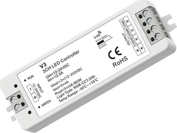 | V3 constant voltage controller 12-2V DC 3 A, for RGB, CCT LED strips, 3 channelrFeatures: Supports lighting systems: single color (single zone or multiple zone), dual color, RGB, CCT.096 levels 0-100% dimming smoothly without any flash. Compatile with dimmale LED stripsuls.3 levels color temperature (warmneutralcool white light).Built-in 10 dynamic RGB modes, including jump or gradual change style.Light onoff fade time selectale.Simultaneous auto-transmission: automatically transmits the signal to another controller within 30m, synchronizes the operation with other controllers (it is recommended not to eceed 25 controllers connected to a push switch).Match utton for connecting remote controls.Can e controlled y 2. GHz RF remote controls, push switches, sensor switches.Control with the SkySmart smart app is supported.One controller can control up to 10 remote controls. One remote control can control an unlimited numer of controllers within 30 m.Controller adopts the most advanced PWM (Pulse Width Modulation) digital control technology, it is used for controlling constant voltage LED lamps.Reverse polarity and short circuit protection.Certificates: CE (EMCLVD), RoHS.rTechnical data:Product model: V3.Compatiility: Skydance R15, R16, R8-1, R9, RT, R8, RT9, RS3, RS, RS8, R21, R22 T3, T3-1, T3-K.Numer of channels: 3.Controlled lighting systems: RGB, CCT.Operating frequency: RF 2.GHz.Supply voltage: 12V-2V DC.Output voltage: 12V-2V DC.Output current: A per channel.Output power: (8-96)W per channel.PWM frequency: 1000 Hz.Grayscale: 096 levels.Dimming range: 0-100%.Operating distance: up to 30m.Safety class: IP20 (not waterproof).Certificates: CE, EMC, LVD, RED, RoHS.Operating temperature: -30~+55°C.Dimensions: 97 33 18 mm.Color: white.Weight: 37g.rWarranty: 2 months. |