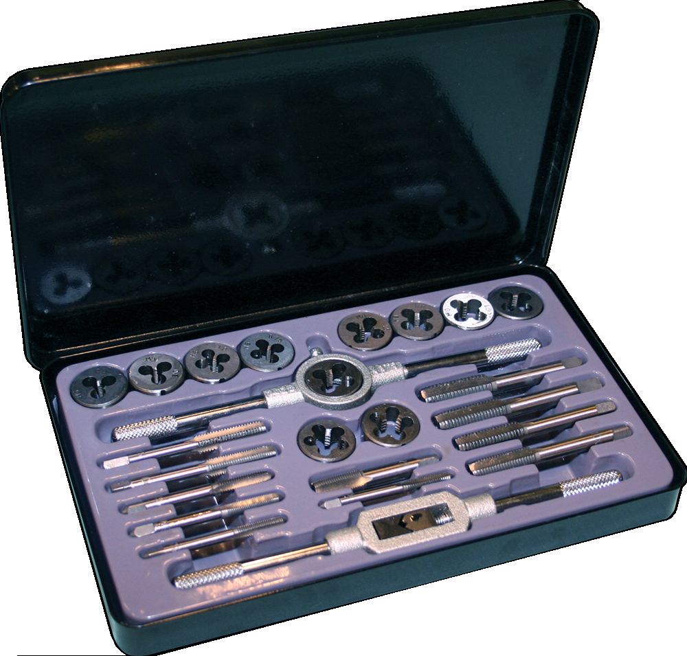 | Augstas kvalitātes metrisko vītņgriežu un vītņurbju komplekts. Instrumenti izgatavoti no cieta kvalitatīva tērauda. Komplektā ietilpst vītņgrieži un vītņurbji: M5 x 0.8, M5 x 0.9. M6 x 0.75, M6 x 1.0, M8 x 1.0, M8 x 1.25, M10 x 1.25, M10 x 1.5, M12 x 1.5, M12 x 1.75, 1/8 NPT27. Regulējami turētāji M25/1", M3-M12 (1/16" - 1/2"). |