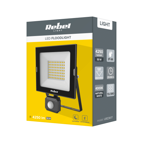 Ārtelpu mitrumizturīgs LED prožektors 50W ar kustības un krēslas sensoru, 4000K, 120°, IP44