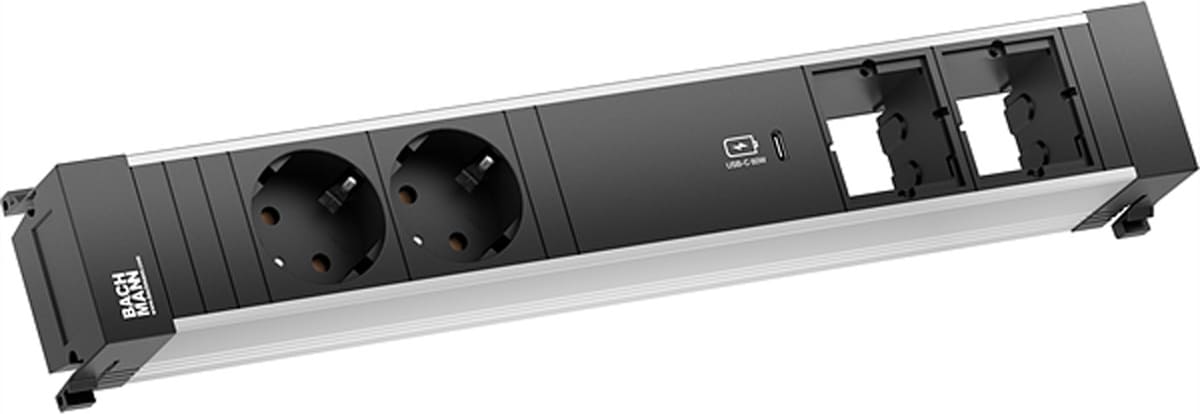 POWER FRAME 2xCEE7/3 1xUSB C Charger 2xCM 0.2m GST18POWER FRAME ALU Large socket strip 2xprotective contact sockets 1x USB-C Charger 60W 2xcustom modules empty Power supply 0.2m H05VV-F 3G1.5mm² with GST18 plug with BACHMANN logo packed in cardboard box
