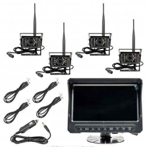 Bezvadu video novērošanas komplekts komerctransportam ar DVR, LCD monitoru un 4 kamerām, SD slots