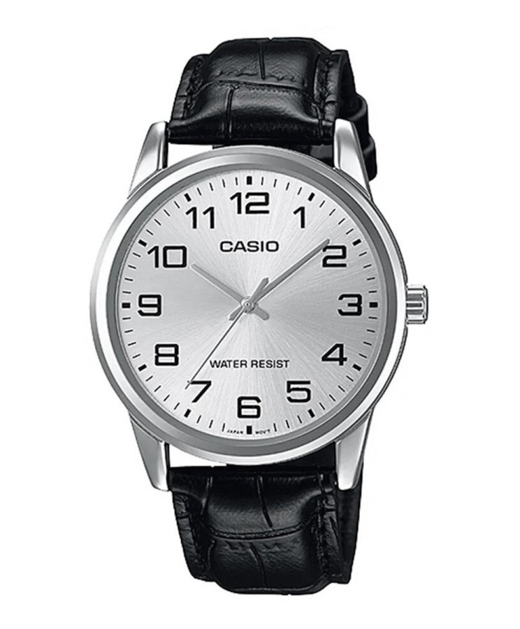 CASIO MTP-V001L-7BUDF — elegant men’s analog watch with a white dial and black genuine leather strap. Its minimalist, classic design suits both everyday wear and business attire. The precise quartz movement, durable stainless steel case, and mineral glass ensure long-lasting reliability.