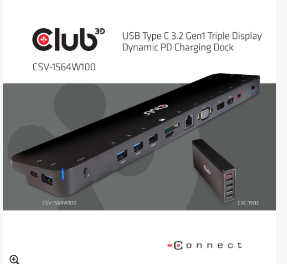 CLUB3D USB Type C 3.2 Gen1 Triple Display Dynamic PD Charging Dock 100W PD Power charger. Connectivity technology: Docking, Host interface: USB 3.2 Gen 1 (3.1 Gen 1) Type-C. Product colour: Black, Compatibility: Lenovo Dell Acer Asus. MSI. Toshiba Apple HP Razer, Certification: Meets ROHS, FCC, and CE EMI requirements