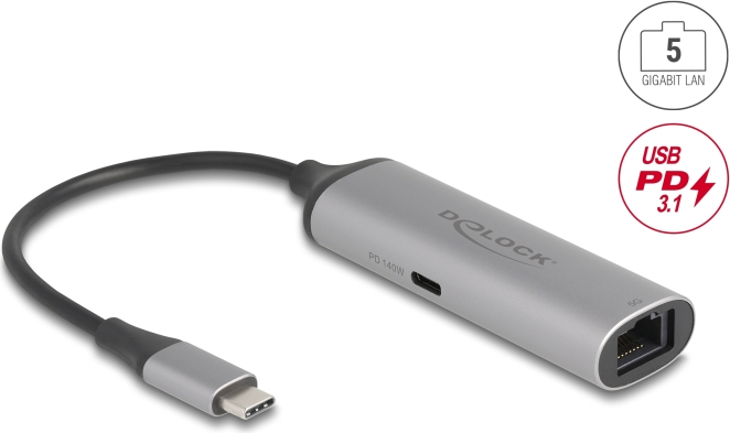 Delock USB Type-C™ Network Adapter 5 Gigabit LAN 1 x RJ45 with Power Delivery PD 3.1 140 watt
