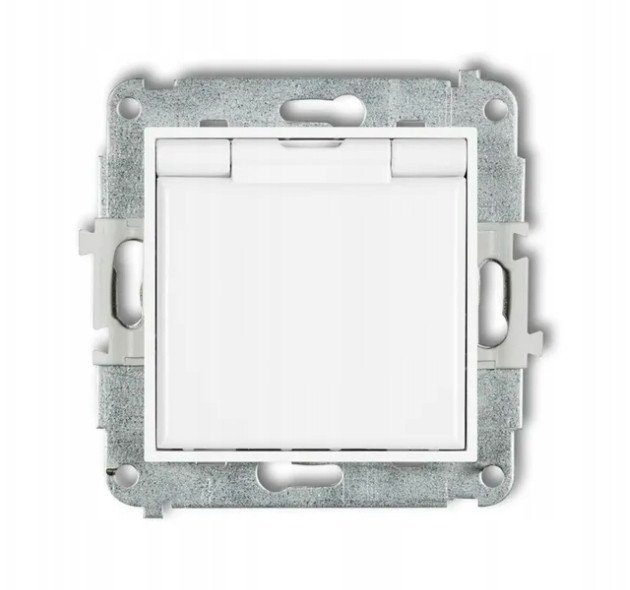 Gniazdo bryzgoszczelne Karlik Icon IGPB-1zp z uziemieniem 2P+Z klapka biaa, przesony torów prdowych biae