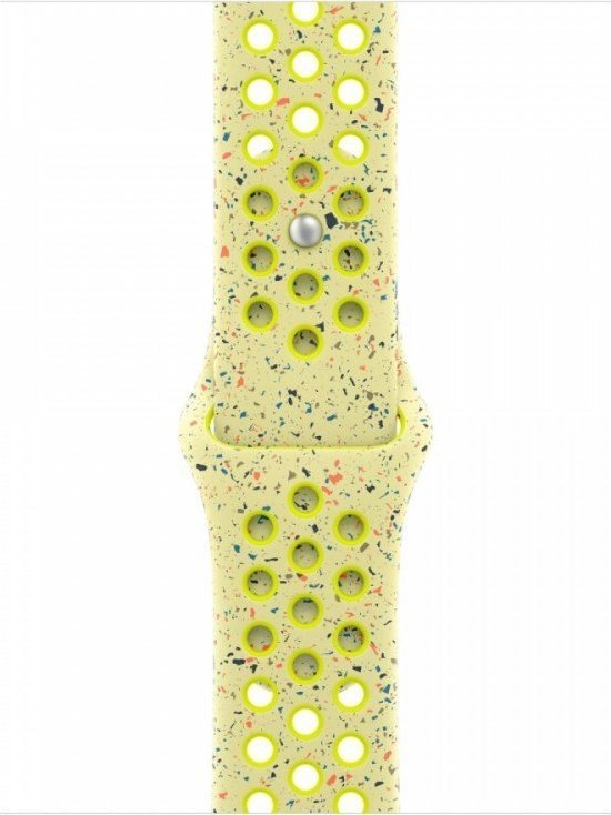 Pasek sportowy Nike w kolorze promiennym zielonożółtym do koperty 42 mm - rozmiar M/L Pasek sportowy Nike jest mocny i wytrzymały, a jednocześnie zaskakująco miękki. Jego przewiewność zwiększają specjalnie wytłoczone otwory. Kolorowe płatki ułożone w losowe wzory nadają każdemu paskowi niepowtarzalny wygląd. Gładki, zwarty materiał jest przyjemny w dotyku i elegancko oplata nadgarstek. A napa w nowym aluminiowym zapięciu z napą i szlufką ma teraz matowe wykończenie.