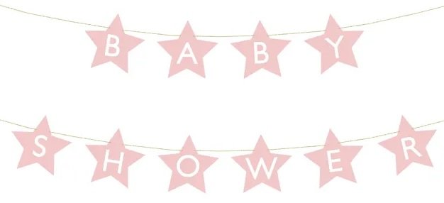 A star-shaped banner with the inscription Baby Shower made of light rose paper, string dimensions approx. 3 m.