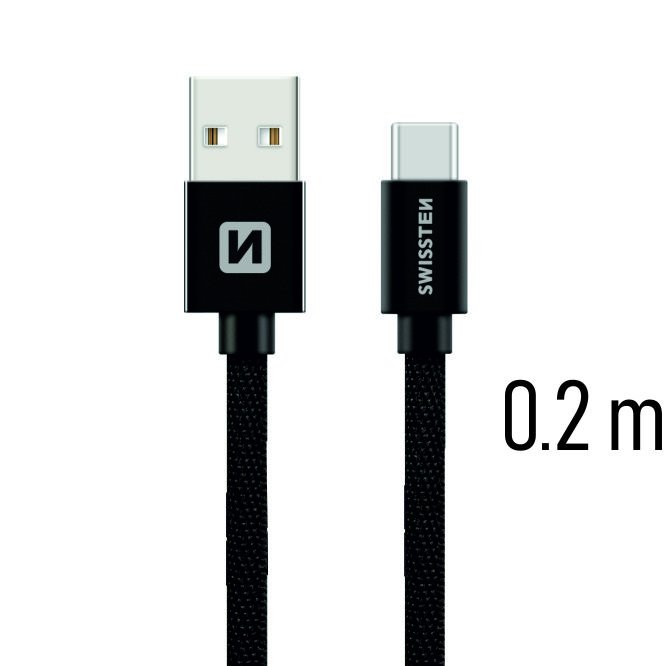 Augstas kvalitātes tekstila datu kabelis USB / USB-C ar garumu 0,2 m. Kabelis ir pastiprināts, lai nodrošinātu lielāku strāvu (līdz 3A) un spēj nodrošināt ātru 480 Mb/s datu pārraidi. Iepakots Swissten mazumtirdzniecības iepakojumā.