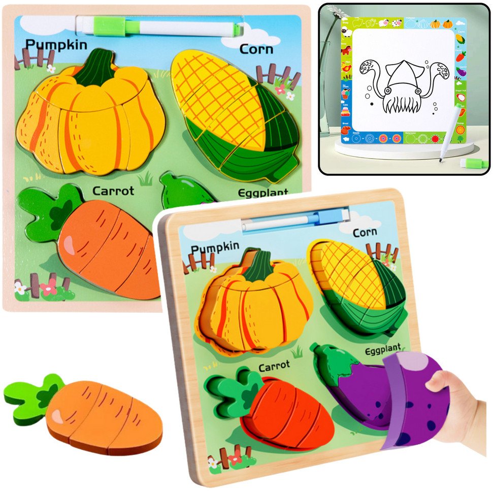 Ukadanka Tablica 2w1 Drewniana Edukacyjna Warzywa Pisak