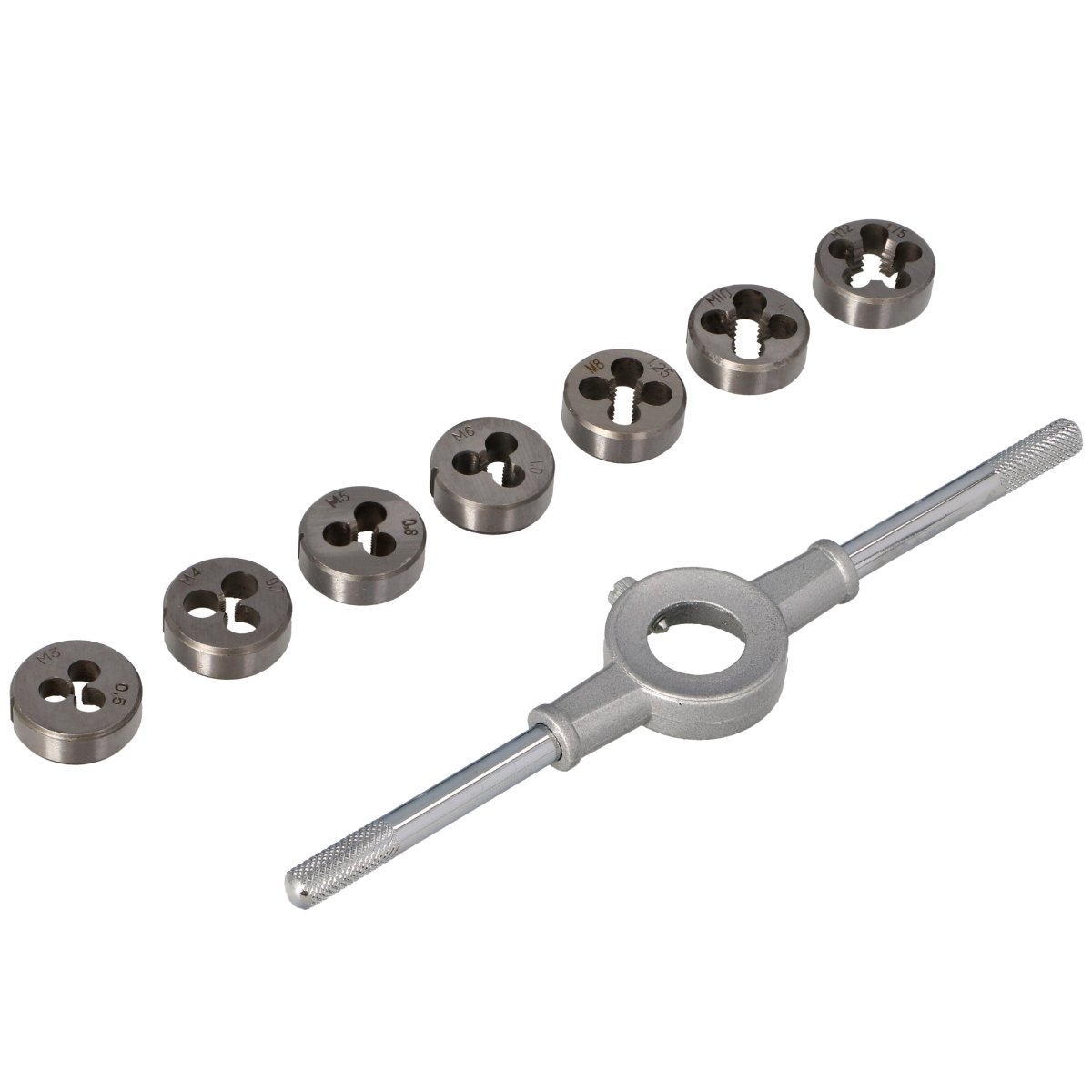 Vītņgriežu komplektā ietilpst rokturis un M3, M4, M5, M6, M8, M10, M12 vītņgrieži. Materiāls - gultņu instrumentu tērauds ŁH15 /100Cr6.