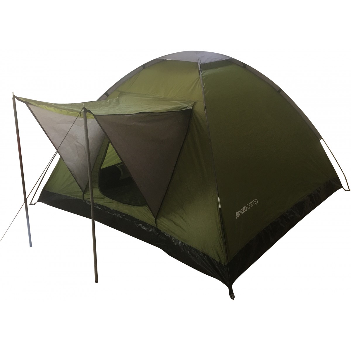4 personu telts, izmērs 200x200x115 cm. 190T poliesters ar PU pārklājumu, 1000mm H20, 110g/m2 grīda. Fb rāmis: 7,9 mm un 16 mm diametra tērauda caurule