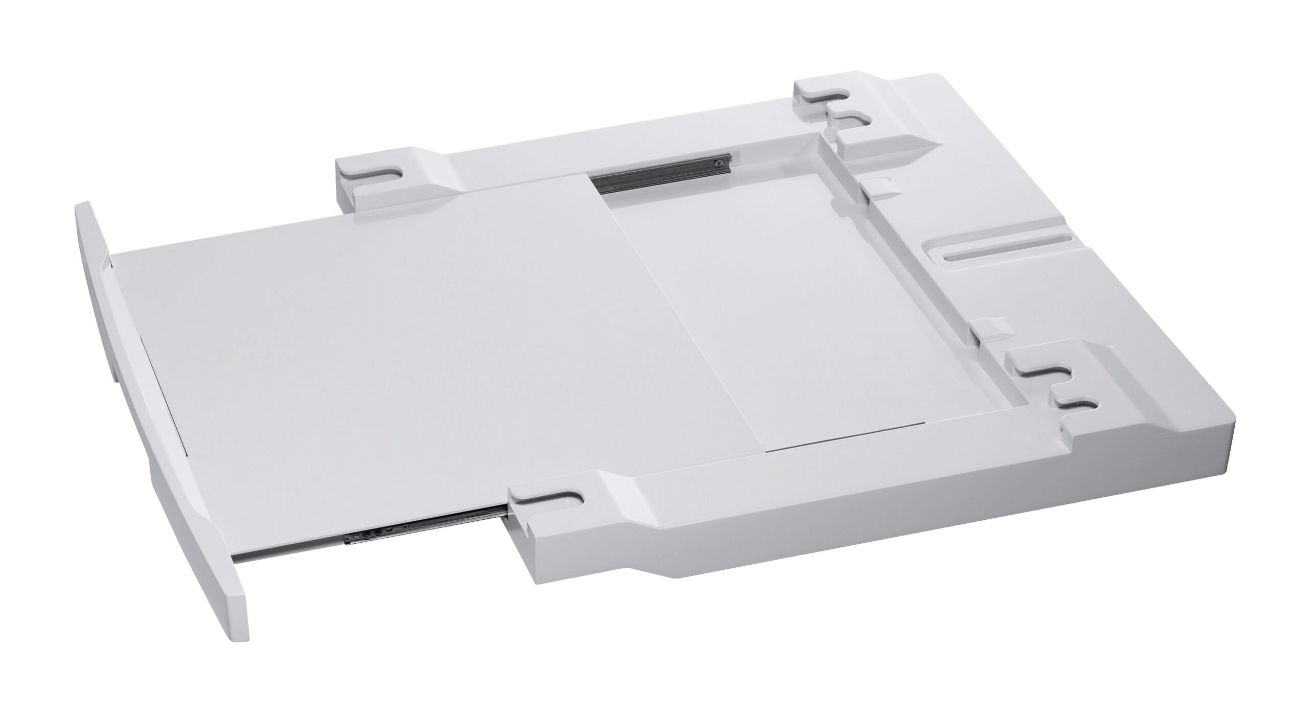 Veļas mazgājamās mašīnas un žāvētāja savietošana, ietaupot vietu. Stiprinājumu komplekts ar bīdāmo plauktu ļauj ērti šķirot apģērbu, izņemot no veļas mazgājamās mašīnas, vai locīt apģērbu, izņemot no žāvētāja.