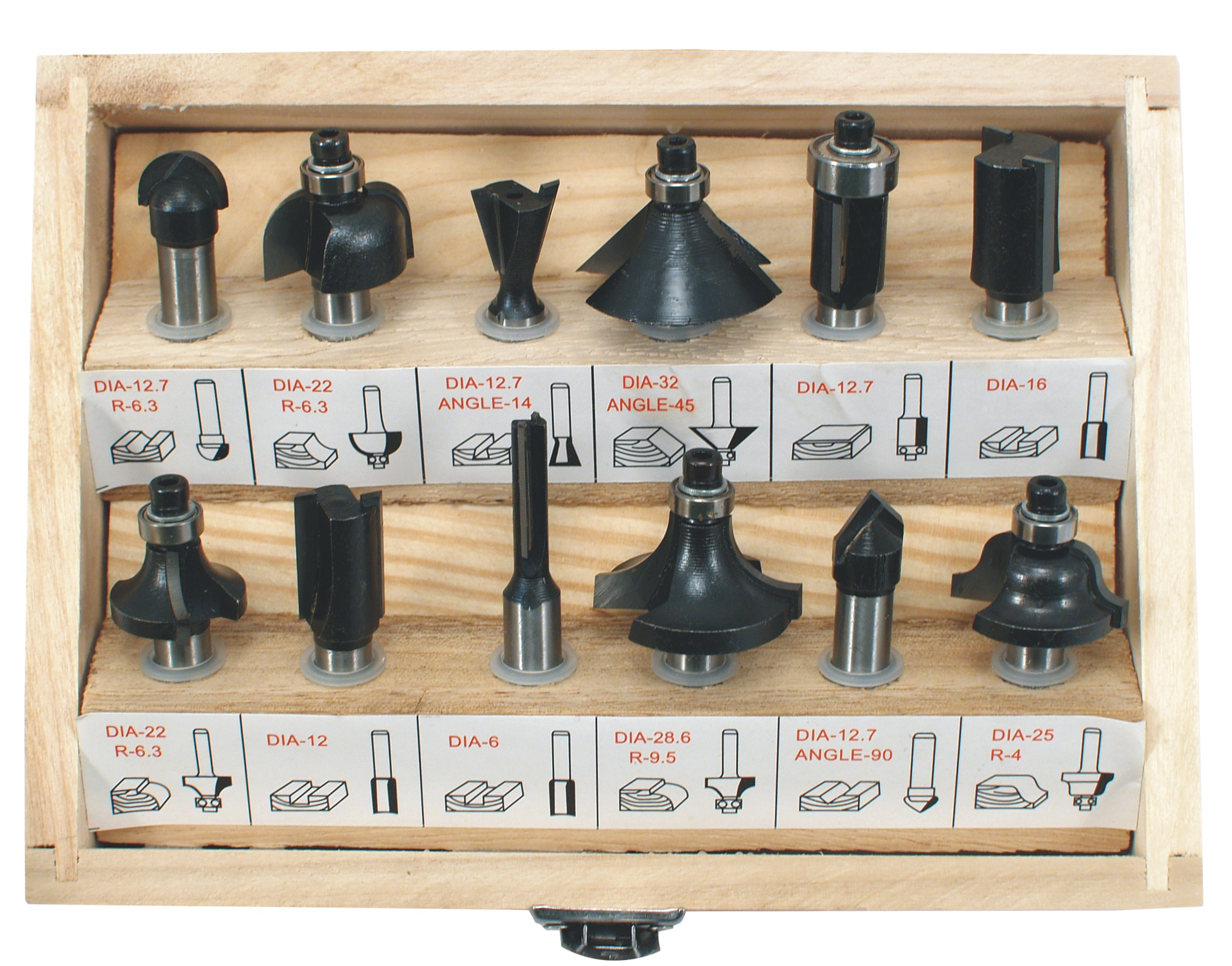 Profilfrēžu komplekts kokam ar 8 mm savienojumu. Volframa karbīda asmeņi. 6 lodīšu gultņu frēzes, lai samazinātu berzi, strādājot ar koku. Komplektā ietilpst sešstūra atslēga gultņu nomaiņai. Frēzes ir paredzētas darbam gan ar cietu, gan mīkstu koku, skaidu plātnēm, saplāksni u.c.