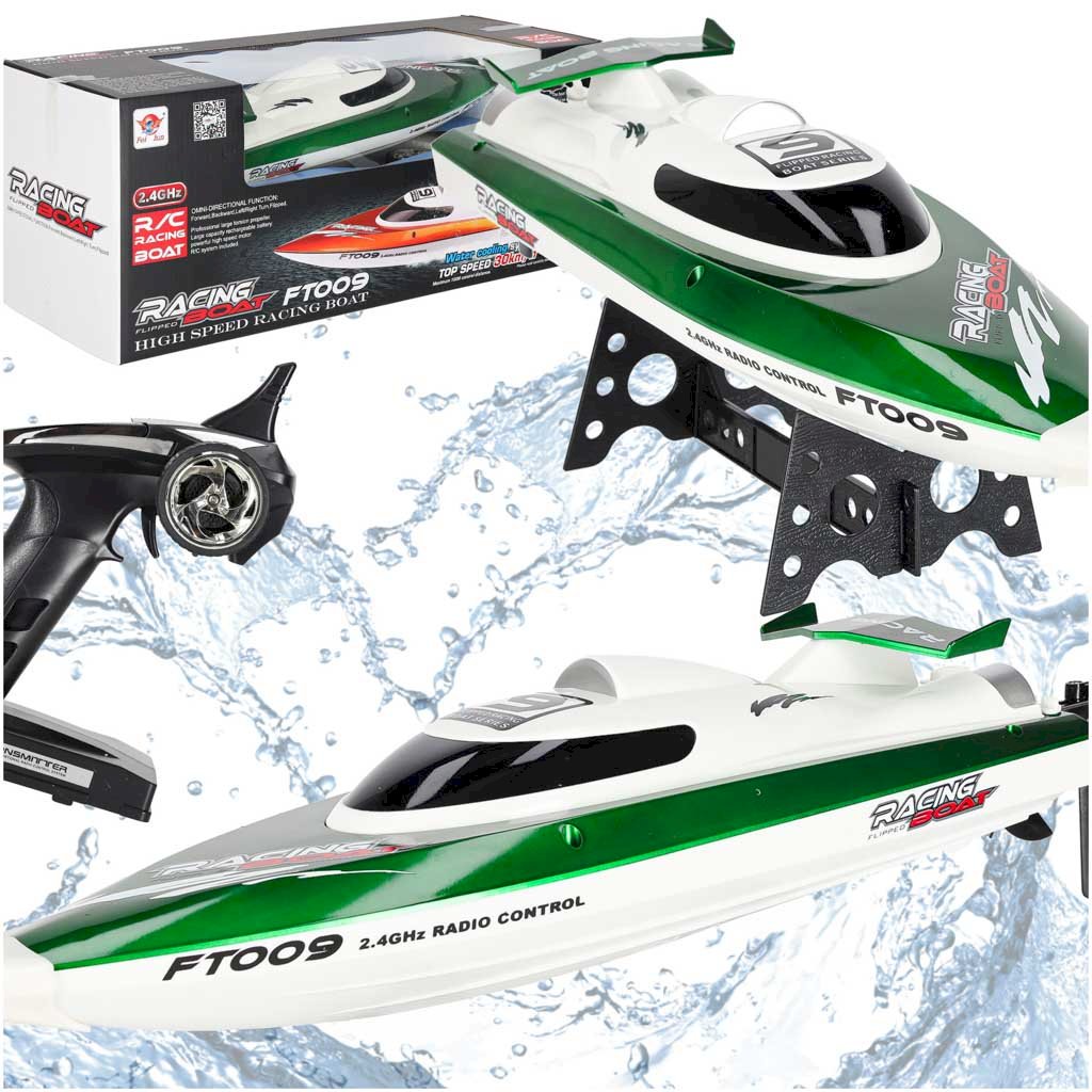 RoGer RC High‑Speed Remote Control Boat FT009 Green, suitable for children from 8 years and adults, is a remote‑controlled high‑speed watercraft with a 540 motor and 7.4 V 1500 mAh battery, capable of reaching speeds up to 30 km/h and delivering dynamic performance on the water; the sealed, reinforced ABS plastic hull protects the electronics from water, and the 2.4 GHz radio controller allows forward, reverse and turning control at long range (up to approx. 100 m), the set includes the boat, Li‑Po battery, charger, spare propeller and controller, making it a great choice for pond, lake and pool play and offering both kids and adults exciting high‑speed water racing with precise control. |