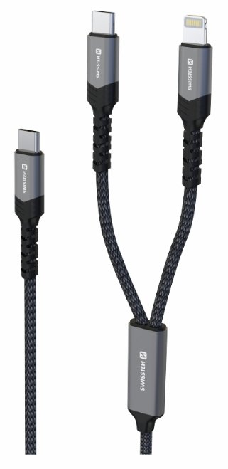 The SWISSTEN 2-in-1 charging cable USB-C / USB-C + Lightning 100W 1.5m is the perfect choice for fast and efficient charging of mobile phones, tablets, and laptops. With support for up to 100W power delivery, it provides enough energy even for demanding devices. When both connectors are plugged in, the power is smartly distributed between devices – USB-C delivers up to 54W and Lightning up to 19.8W, allowing for convenient and safe multi-device charging. The durable textile braiding ensures a long lifespan and protection against damage.