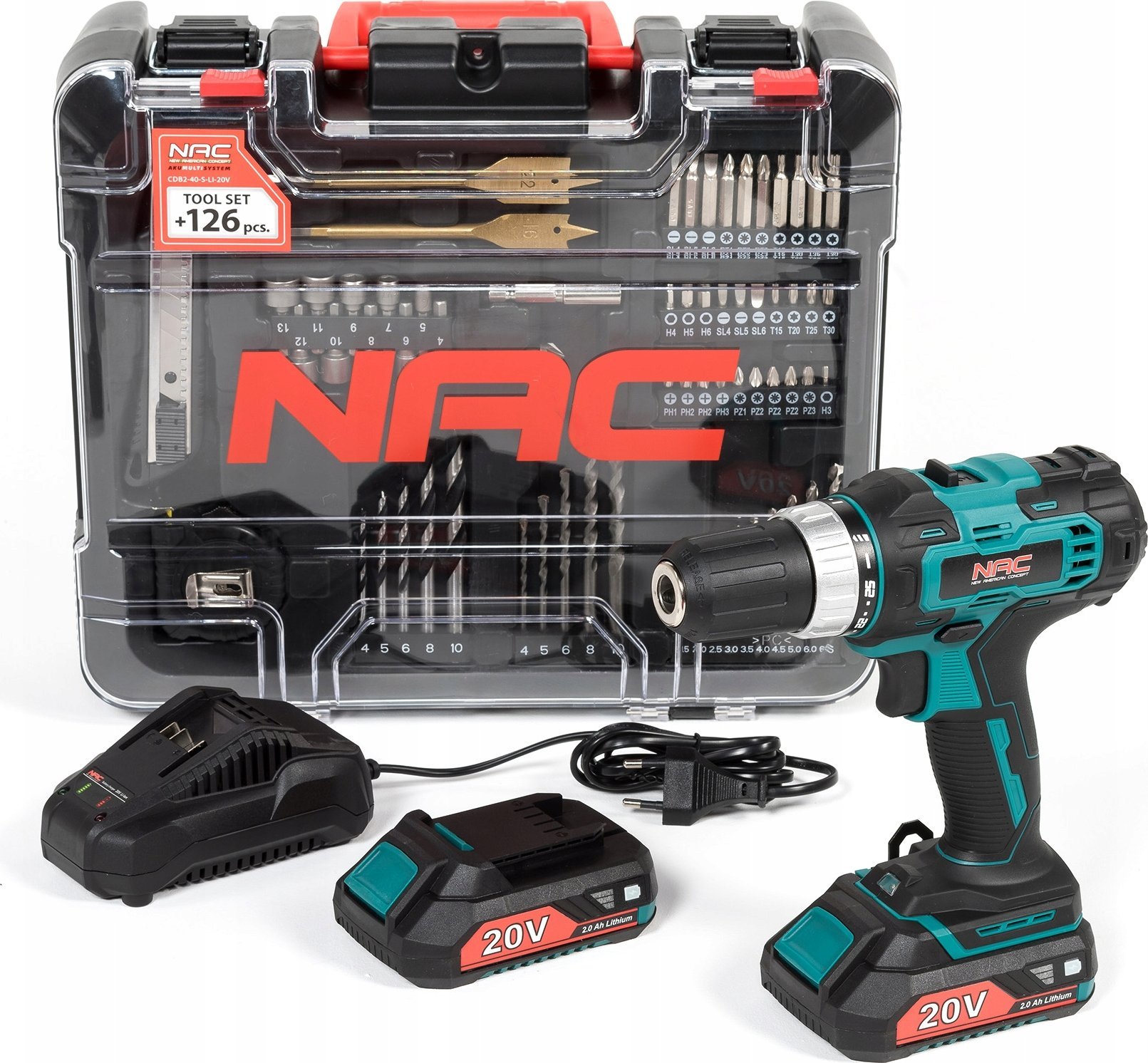 Wiertarko-wkrtarka NAC CDB2-40-S-LI-20V 20 V 2 x akumulator 2 Ah + zestaw 126 akcesorii