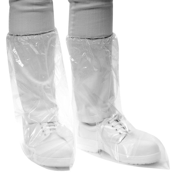 Shoe covers made of embossed transparent polyethylene. Highly durable and moisture-proof. Equipped with an integrated elastic band for a secure and comfortable fit. Ideal for use in the meat and food industry, as well as in wet or dirty working environments.