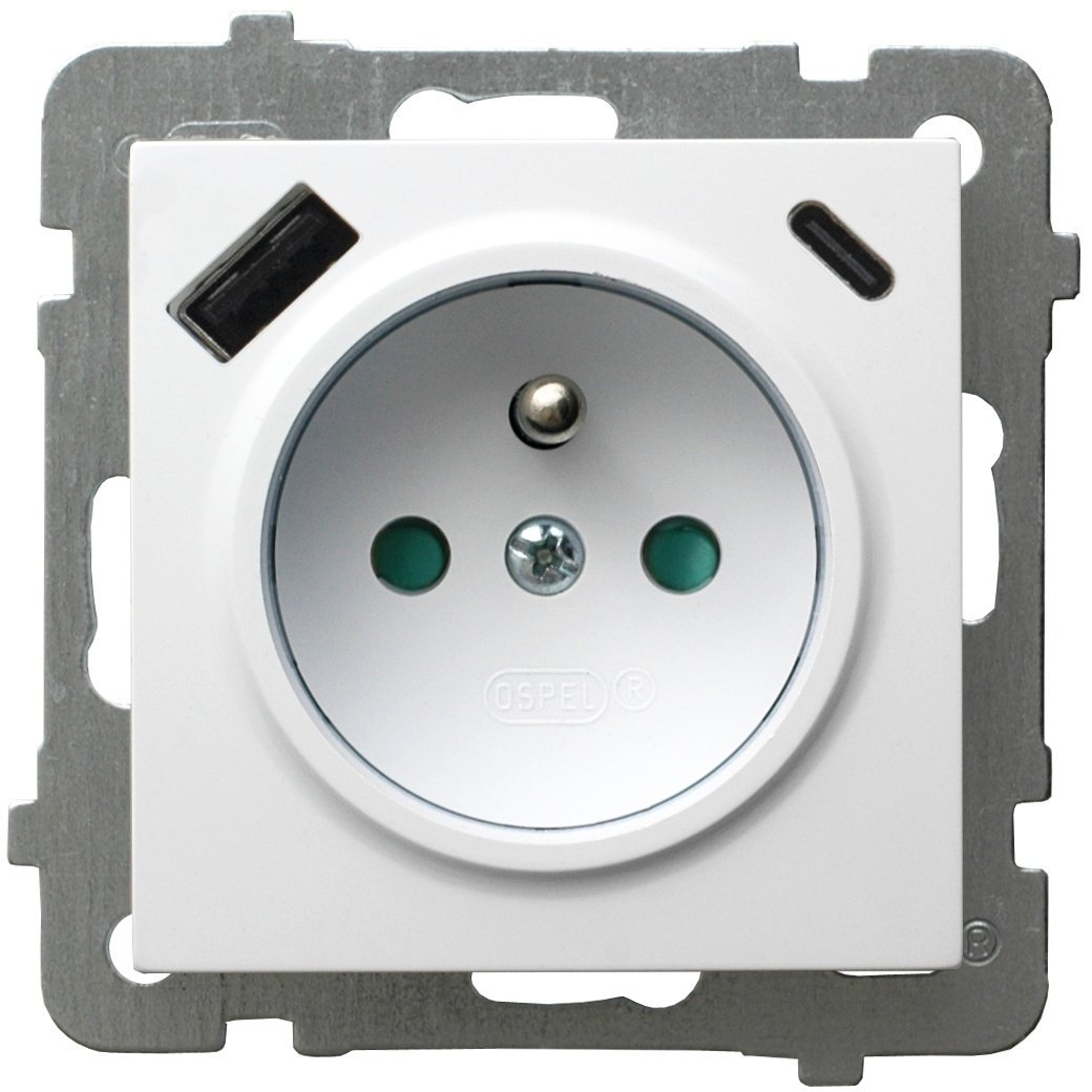 AS Gniazdo pojedyncze z uziemieniem z przesonami torów prdowych, z adowark USB A+C biay GP-1GZPUSBAC/m/00