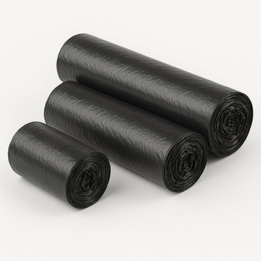 Black garbage bags intended for household use. Packed in rolls, durable, perforated, and easy to tear off. Made from high-density polyethylene (HDPE).