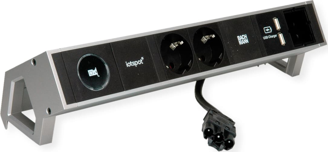 DESK2 1xiotspot 2xCH 1xUSB Charger 1xCM 0.2m GST18 InoxDESK2 iotspot colour INOX 1x iotspot 2xprotective contact sockets 35° black 1xUSB double charger 5V DC / 3.1A 1xcustom module empty supply cable 0.2m H05VV-F3G1.5mm² black with GST18 plug incl. mounting bracket with Bachmann logo packed in cardboard box iotspot is an easy-to-implement and easy-to-understand tool for smart workplace management. Integrated into a DESK 2, for example, it is a unique product for the modern office environment. With the help of an intuitive app, the user can quickly find out about available workstations, book them conveniently and optionally find them using the integrated map function. An extension of the stay or early cancellation is possible with just one click. The app also offers numerous additional features, such as the integrated search for colleagues. - Companies benefit from the accurate collection of relevant user data, visualised facts and compliance with the GDPR.