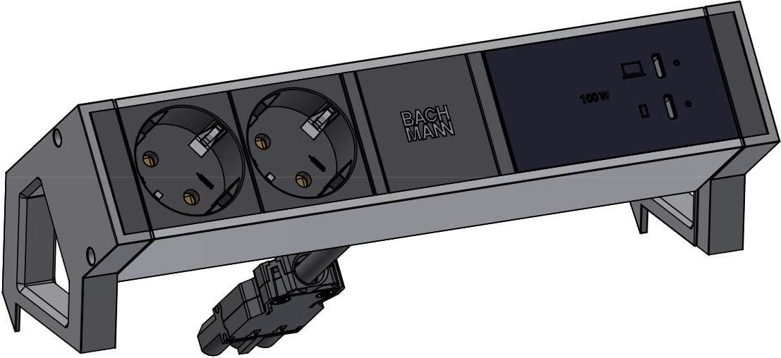 DESK2 2xCEE7/3 1xUSB C&C 100W 1xCM 0,2m GST18 RAL9005DESK2 ALU Steckdosenleiste Farbe schwarz, ähnlich RAL9005 mit erhöhtem Berührungsschutz 2x Schutzkontaktsteckdosen schwarz 1xUSB C/C 100W Charger 1x Custom Modul leer Zuleitung 0,2m H05VV-F3G1,5mm² schwarz mit GST18 Stecker inkl. Haltewinkel mit Bachmann Logo verpackt im Karton