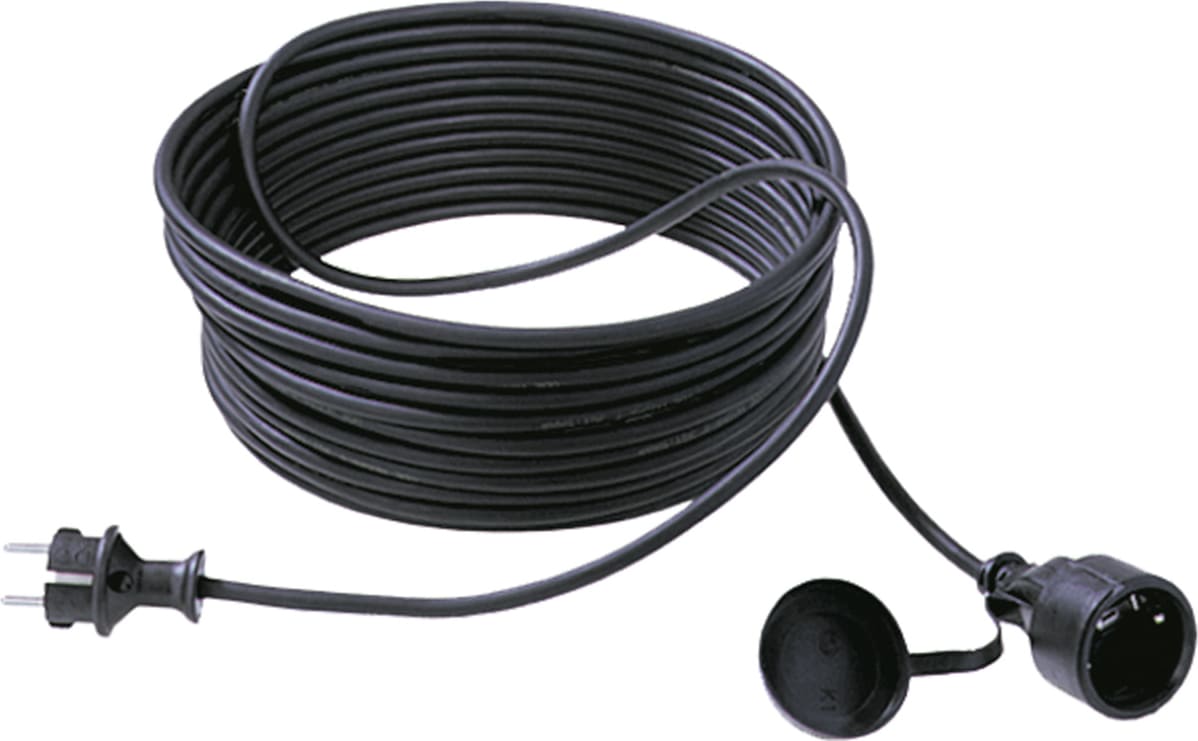 Extension H05RR-F 3G1.5mm² black, 1mCable extension power cable 16A/ 250V~ 10 m H05RR-F 3G 1.5 mm² black CEE 7/7 earthing contact plug central CEE 7/3 earthing contact socket/ cover IP44 unpacked