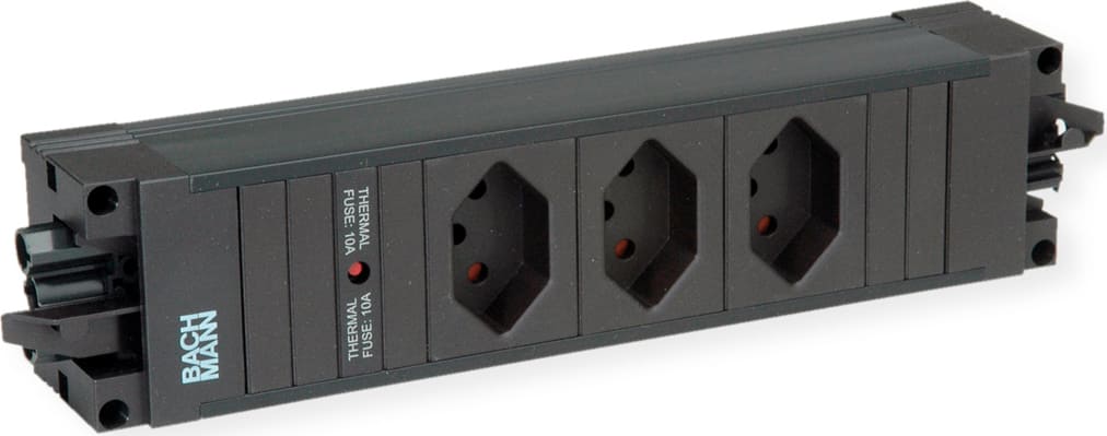 STEP BASE Steckdosenleiste Kunststoffprofil schwarz mit 3xT13 schwarz Stromeingang und -ausgang GST18 mit BACHMANN Logo verpackt im Karton