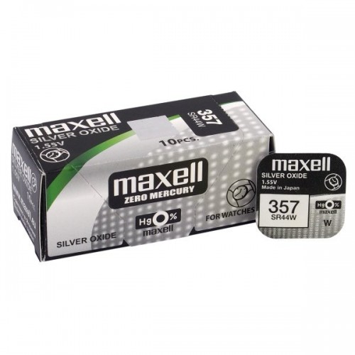 357 baterijas 1.55V Maxell sudraba-oksīda SR44W. 303 iepakojumā 1 gb.