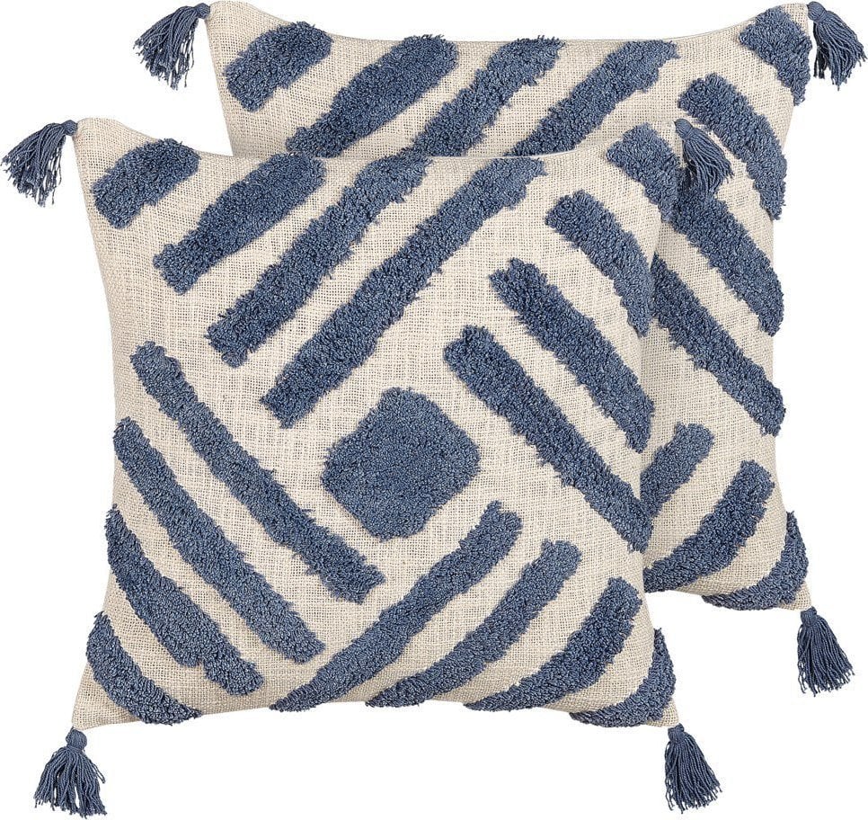 Beliani 2 baweniane poduszki dekoracyjne geometryczny wzór z frdzlami 45 x 45 cm beowo-niebieskie JACARANDA!