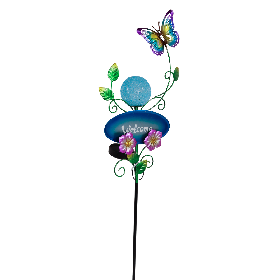 Dārza dekors ar solāro gaismu ir krāsains un funkcionāls risinājums dārza vai pagalma rotāšanai un apgaismošanai. Šis metāla dekors ar uzrakstu Welcome, tauriņu un ziediem kļūs par spilgtu akcentu jebkurā vidē, bet solārā bumba nodrošina patīkamu gaismu vakaros. Izgatavots no kvalitatīva metāla un plastmasas, ir izturīgs pret laikapstākļiem. Izmērs 90.2 x 22 x 8 cm.