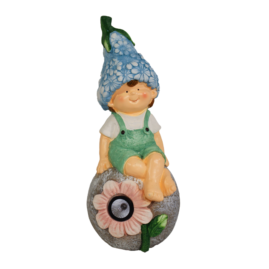 Dārza dekors ar solāro gaismu Puisītis ir sirsnīgs un rotaļīgs akcents dārzam vai terasei, kas lieliski papildina āra vidi ar savu košo dizainu. Dekors attēlo sēdošu puisīti ar ziedu cepuri uz akmens, integrētā solārā gaisma vakaros nodrošina patīkamu apgaismojumu. Izgatavots no kvalitatīva polirezīna, kas ir izturīgs pret dažādiem laikapstākļiem un viegli kopjams. Izmērs 23 x 21 x 48 cm.