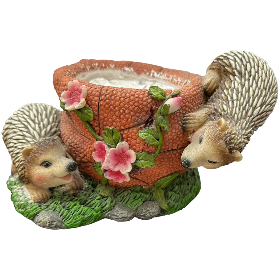 Dārza dekors - puķu pods ar ezīšiem ir dekoratīvs un praktisks akcents jebkurā dārza vai terases stūrī. Kompozīcija veidota kā ziediem rotāts puķu pods, ko sargā divi rotaļīgi ezīši. Izgatavots no izturīgas sveķu masas, tas ir piemērots novietošanai ārpus telpām un noturīgs pret laikapstākļiem. Puķu poda iedobē iespējams stādīt mazus augus vai izmantot kā trauku sīkumiem. Izmērs 22 x 14 x 13 cm.