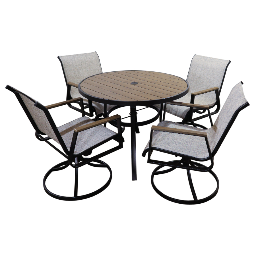 | Elegantais dārza mēbeļu komplekts ar apaļo galdu un četriem grozāmajiem krēsliem ir lieliski piemērots maltītēm un atpūtai svaigā gaisā ar ģimeni un draugiem. Izturīgais metāla rāmis melnā krāsā kombinācijā ar koka imitācijas galda virsmu un gaišiem tekstila sēdekļiem piešķir komplektam modernu un stilīgu izskatu, kas harmoniski iekļausies jebkurā dārza, terases vai balkona dizainā. Krēsli ar grozāmo mehānismu nodrošina papildu komfortu un ērtības, savukārt izturīgie materiāli garantē ilgmūžību un vieglu kopšanu dažādos laikapstākļos. Kompaktais dizains ar apaļo galdu ir ideāls risinājums gan nelielām, gan plašākām āra zonām, radot perfektu vietu gan ikdienas maltītēm, gan svinīgiem brīžiem. Galda izmērs 100 x 74 cm, krēslu izmērs 59 x 57 x 89 cm. |
